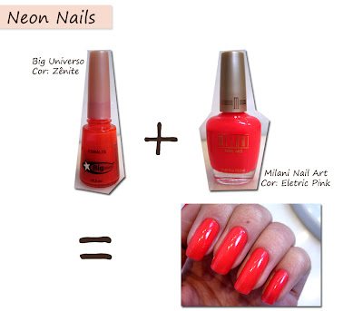Amores, lembram quando postei esse look e um monte de gente perguntou sobre o esmalte que eu estava usando!?!? Então as cores são o Zênite da Big Uiverso ( que ganhei de uma amiga, e acho que ela comprou em Goiânia tipo em farmácia ) e o Pink Eletric da Milani ( que eu comprei nos EUA) !! Nas fotos infelizmente não dá pra ver de fato as cores como elas são!! Mas o tom na unha fica bem fluor, é bem indiscretinho!! rsrsrs